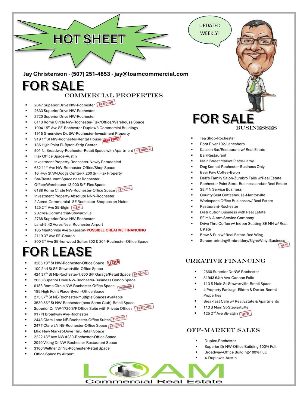 Sometimes I come across sellers who aren't actively looking to sell but would be open if the right opportunity came about. With my vast network of agents, bankers, insurance professionals, and personal contacts I can help find you a property or location if you're looking for something specific.