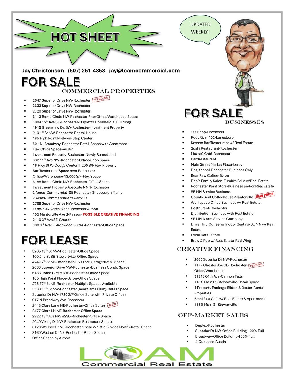 Sometimes I come across sellers who aren't actively looking to sell but would be open if the right opportunity came about. With my vast network of agents, bankers, insurance professionals, and personal contacts I can help find you a property or location if you're looking for something specific.