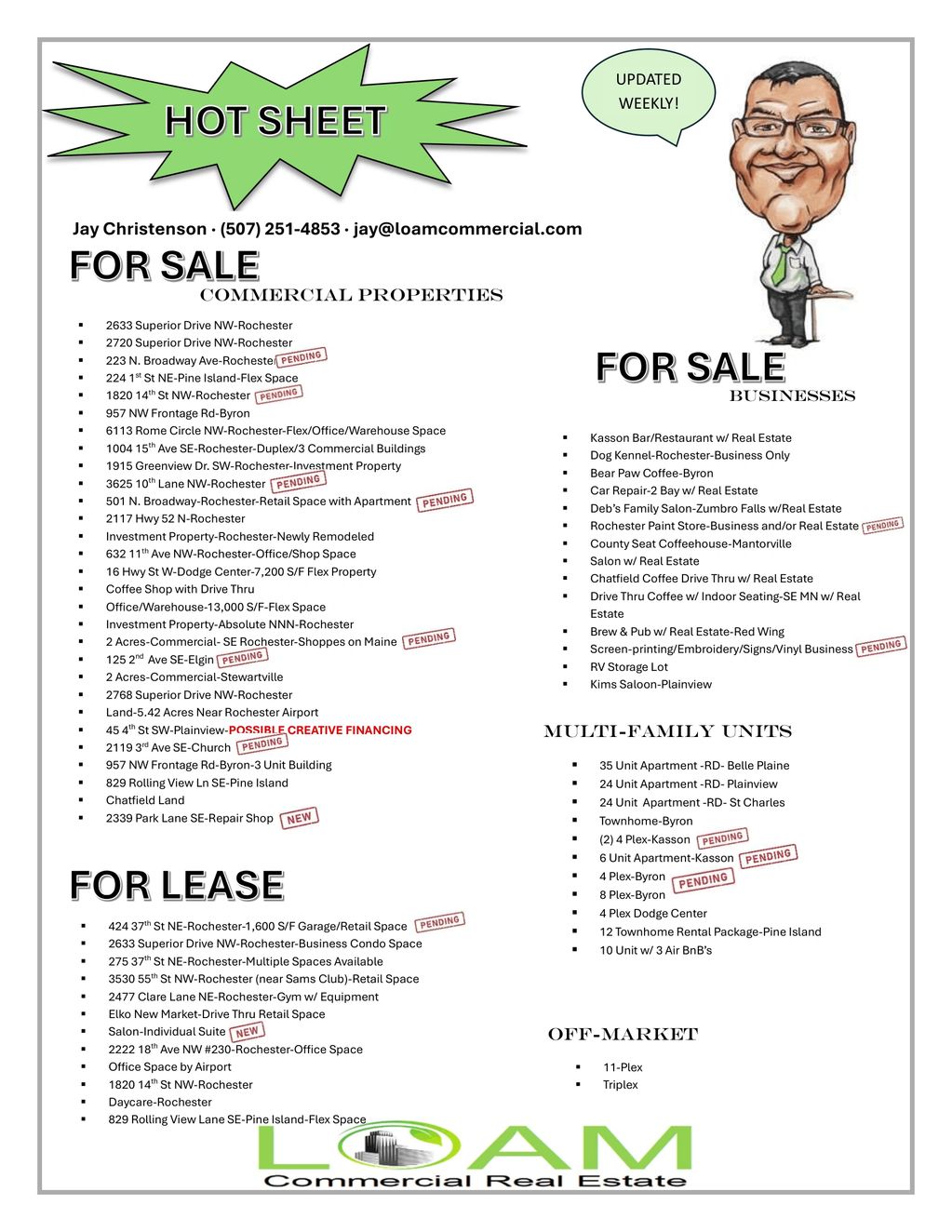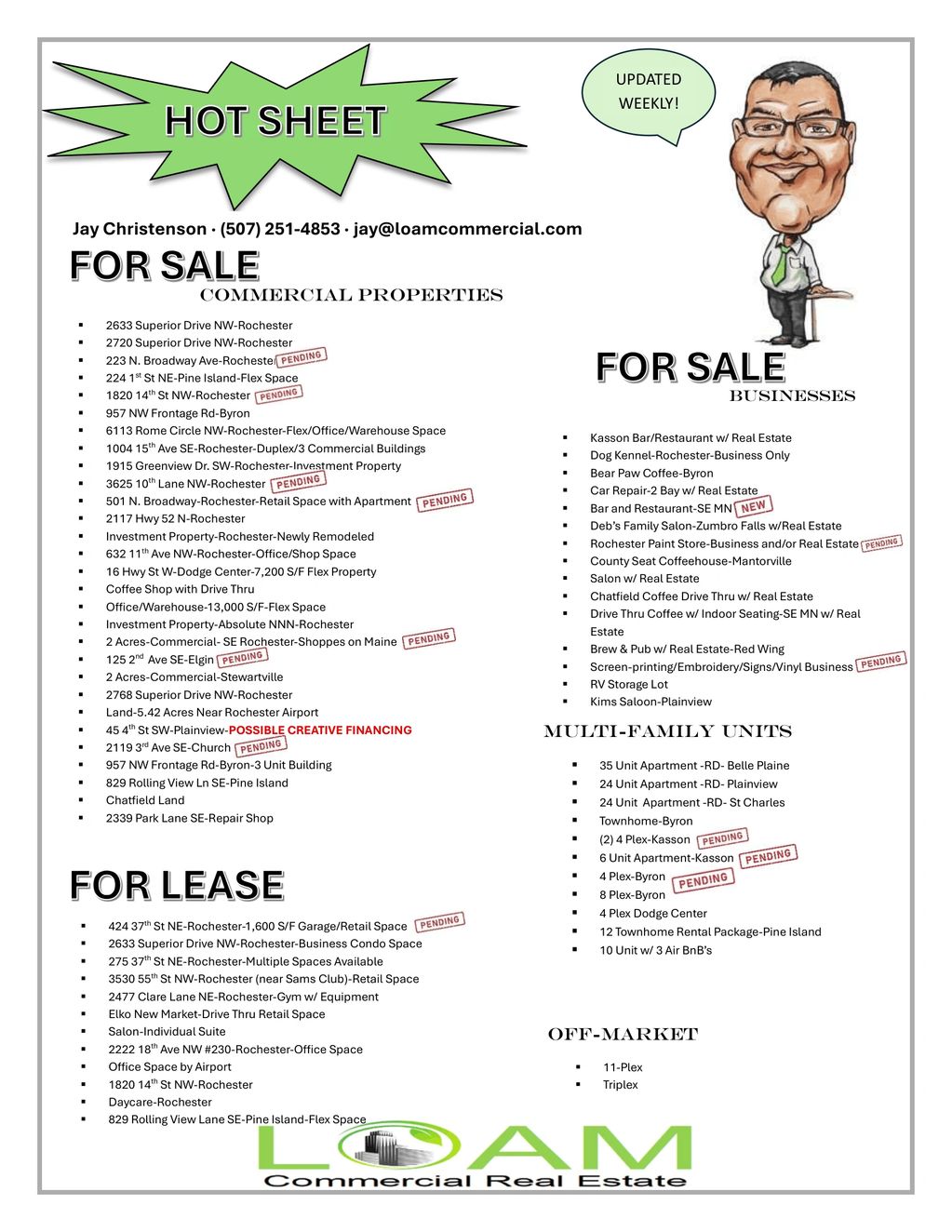 Sometimes I come across sellers who aren't actively looking to sell but would be open if the right opportunity came about. With my vast network of agents, bankers, insurance professionals, and personal contacts I can help find you a property or location if you're looking for something specific.